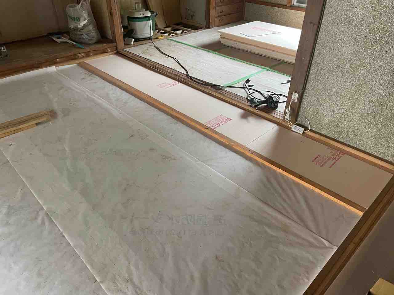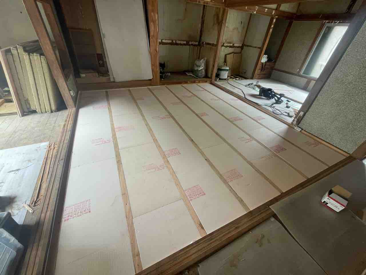 断熱材とカフェ板で55ミリなのでちょっと敷居より下がる感じですが、敷居の角がラウンドしているのでツライチより若干下げた方が納まりがいいです。