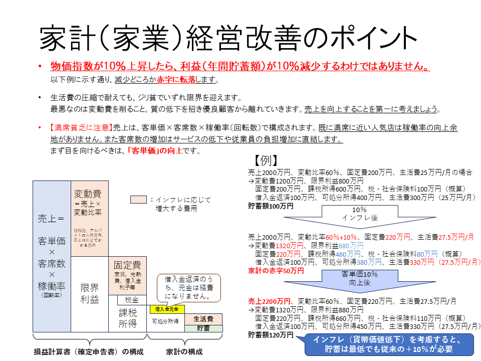 常に満席に近い人気繁盛店は、料理やサービスは問題ないはずですからここ(変動費や固定費)を変えると別の問題が浮上することになりかねません。課題は売上向上になってくるはずです。