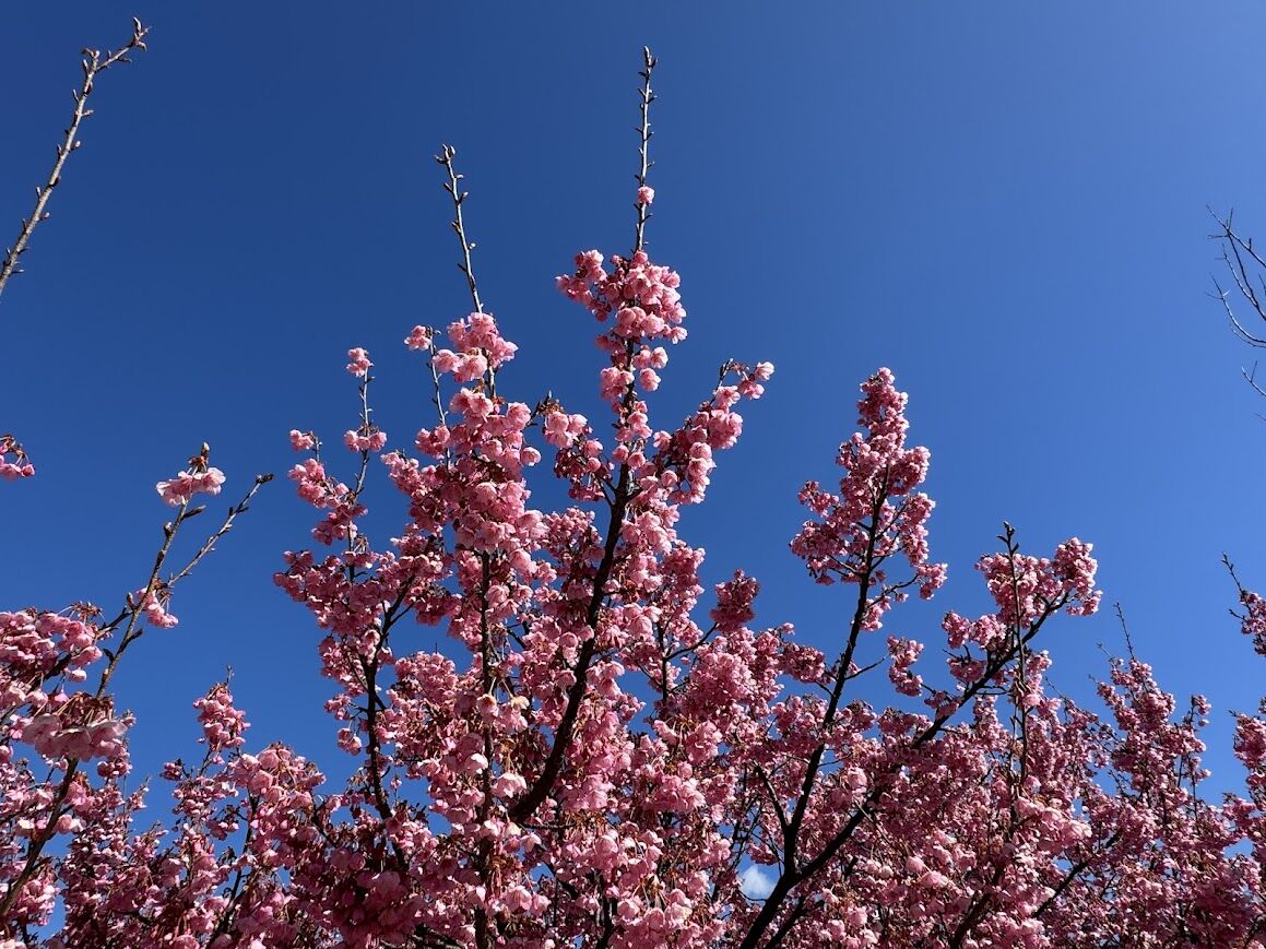 伊豆で最も早く咲く桜。濃いピンク色が、冬の青空と海によく映えます。 -