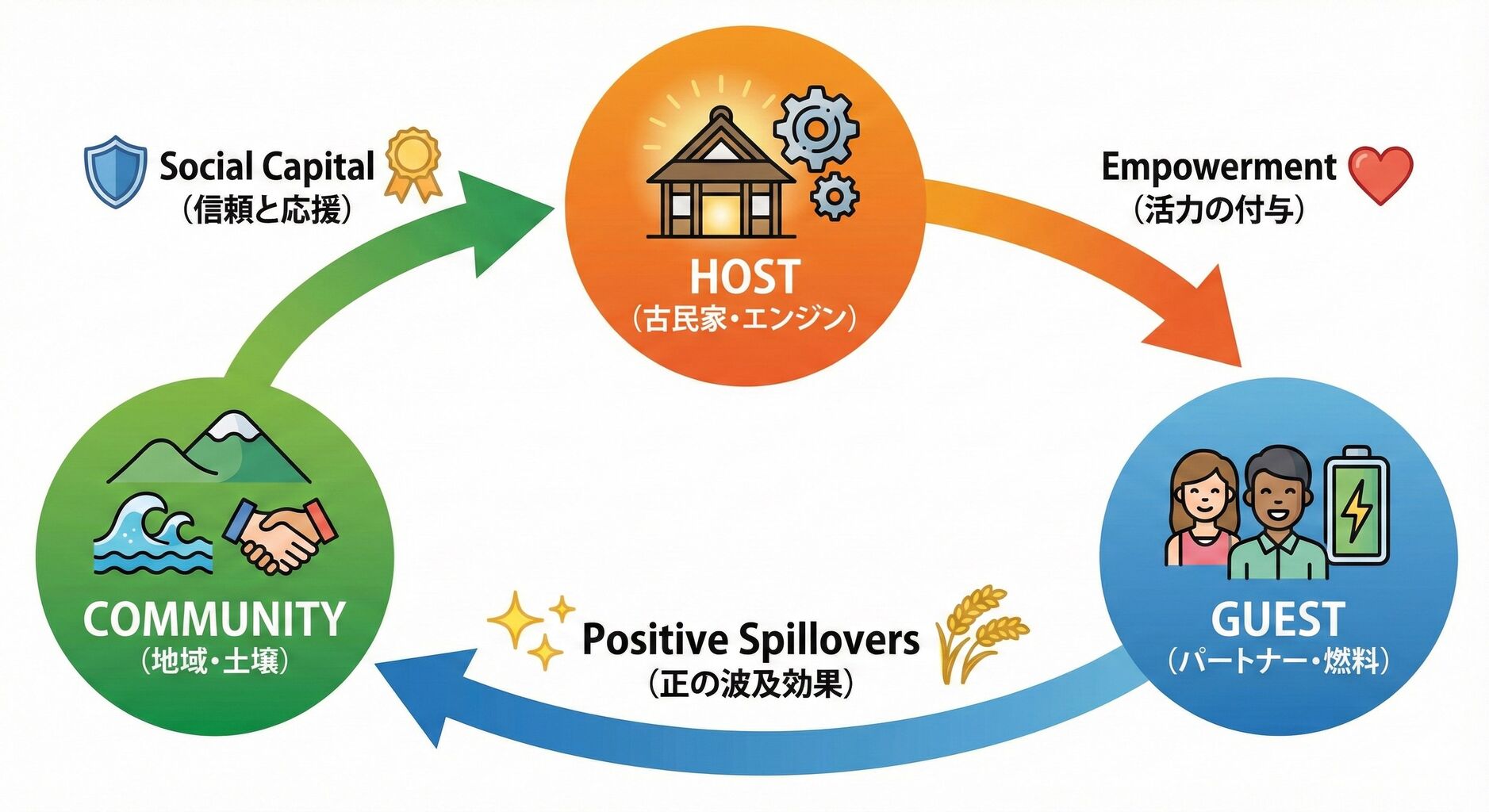 この循環システムにおいて、私たち(ホスト)、ゲスト、そして地域は、それぞれ以下の役割を担う。